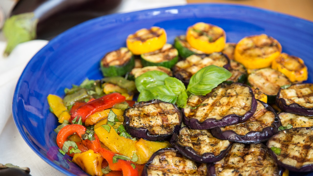 Gegrilltes Gemüse auf einer Platte anrichten und mit frischem Basilikum garnieren.