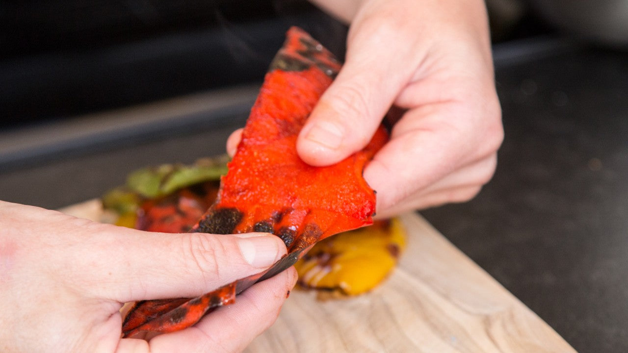 Den Backofengrill auf 250 Grad vorheizen. Die Paprika waschen, entkernen und halbieren. Auf einem Backblech 10 Minuten unter den Grill geben bis die Haut schwarz ist. Danach salzen, die Haut abziehen und in Streifen schneiden.