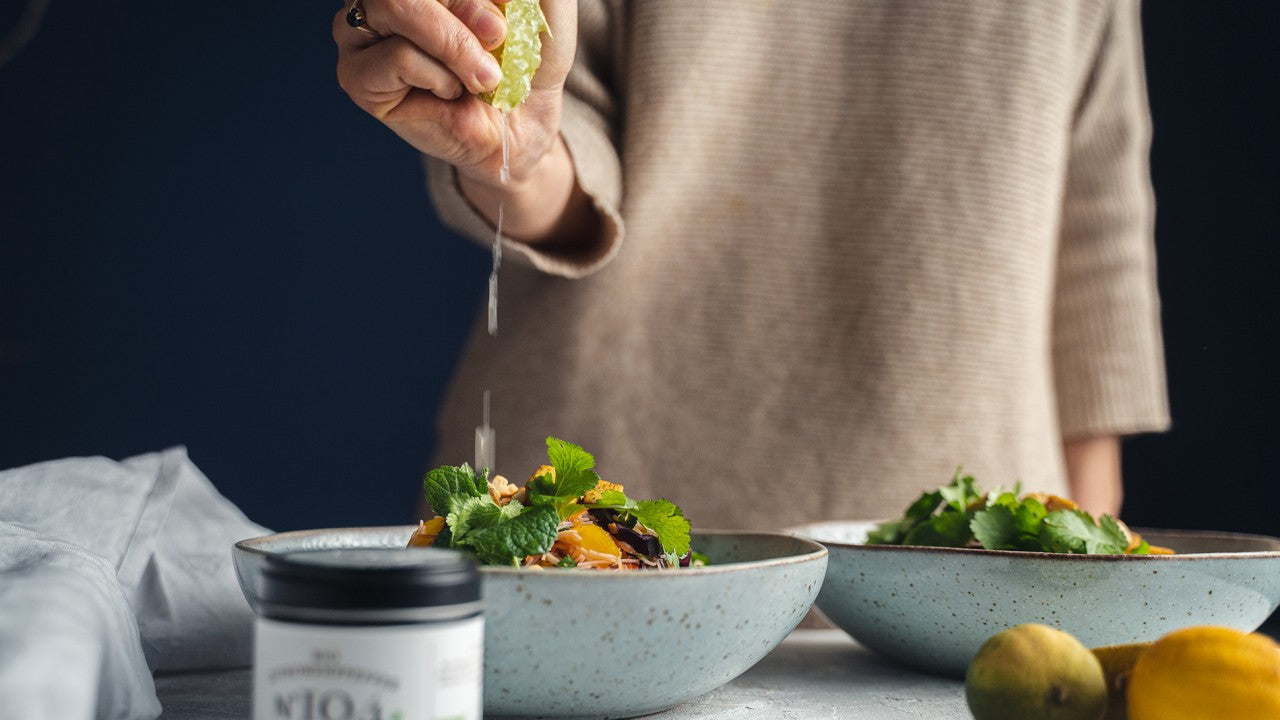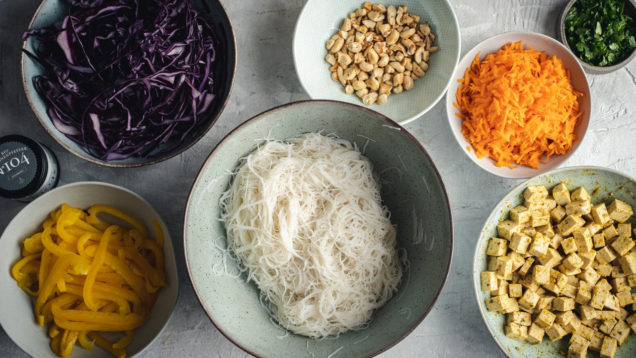 Die Blättchen von Minze und Koriander fein hacken. 2/3 der Kräuter mit dem Gemüse in eine große Schüssel geben. Reisnudeln nach Packungsbeilage zubereiten und untermischen.