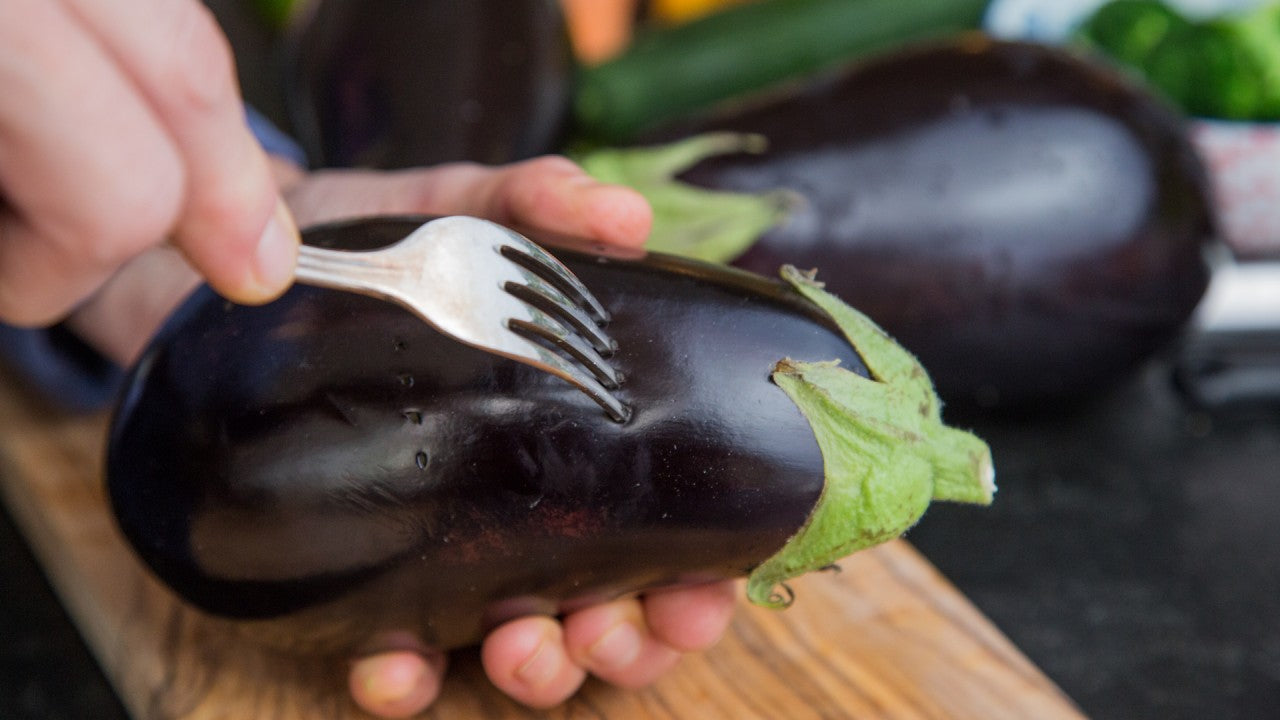 Auberginen waschen und mit der Gabel mehrmals einstechen. Auf einem Backblech etwa 30 Minuten backen, bis das Fruchtfleisch ganz weich geworden ist.