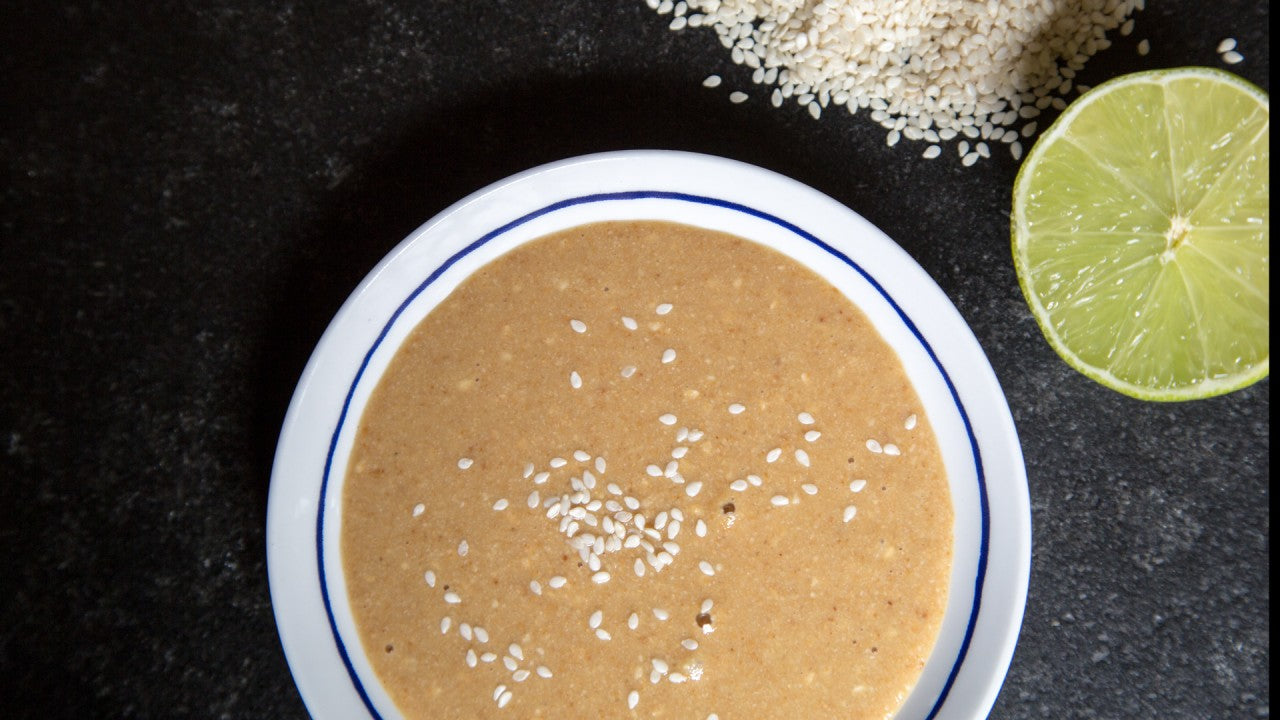 Das Fruchtfleisch herauslösen und in den Mixer geben. Mit Sesampaste, Zitronensaft, Zitronenschale und Olivenöl vermischen.