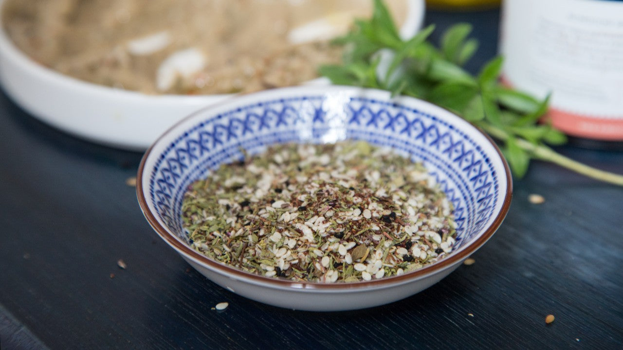 Knoblauch dazu pressen und mit etwas Salz und Pfeffer abschmecken. Petersilie fein hacken und unterrühren. Zuletzt Zatar und etwas Piment d`Especial über die Auberginencreme streuen.