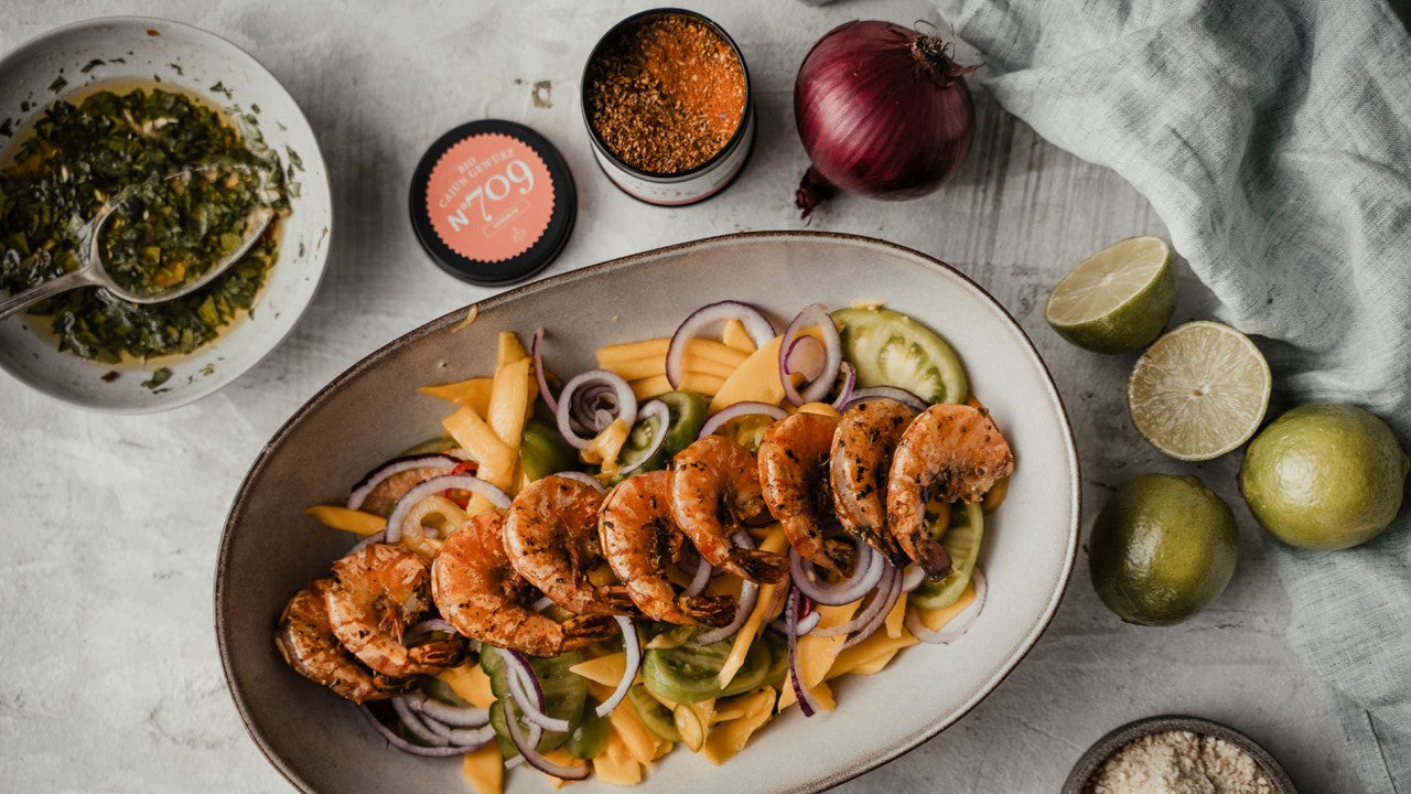 Garnelen in einer Schüssel mit 3 EL Olivenöl und Cajun Gewürz marinieren und mindestens 30 Minuten ziehen lassen.