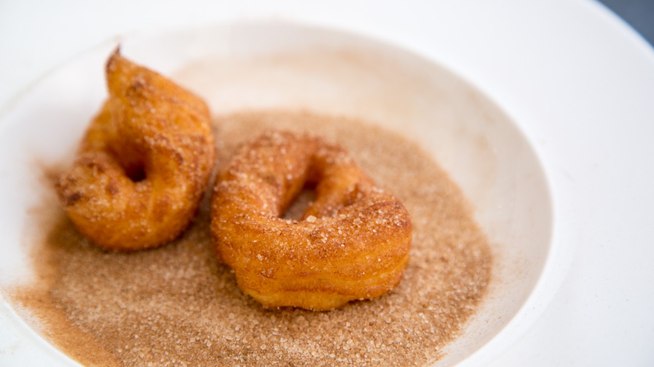 Die noch heißen Churros in Zimt & Zucker wenden.
