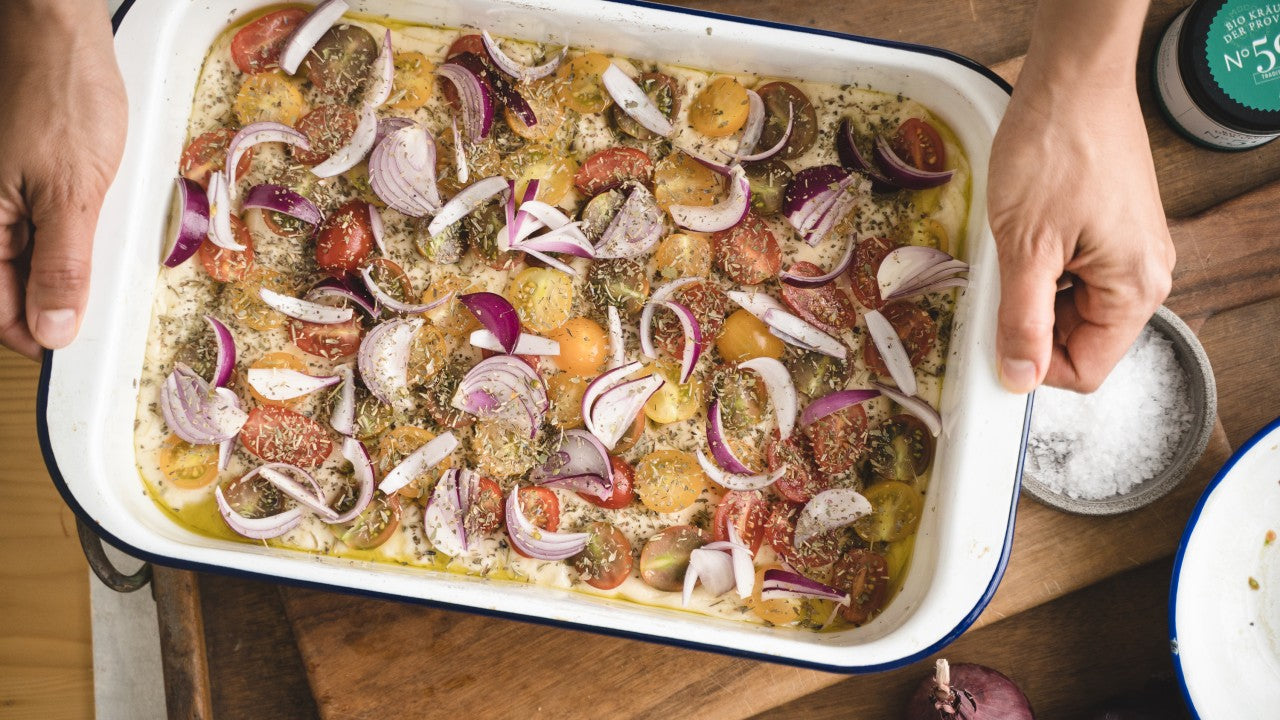 Kirschtomaten halbieren, Zwiebel in Ringe schneiden und auf dem Teig verteilen. Mit Kräutern der Provence und Meersalz bestreuen.