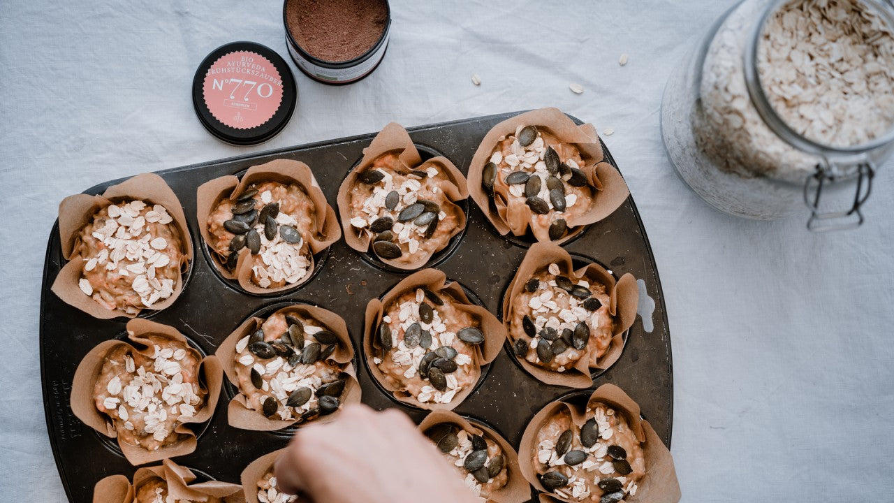 Die Muffinformen einfetten oder mit Backpapier auslegen und den Teig darin verteilen. Mit ein paar Haferflocken und Kürbiskernen bestreuen und die Muffins 20 Minuten backen.