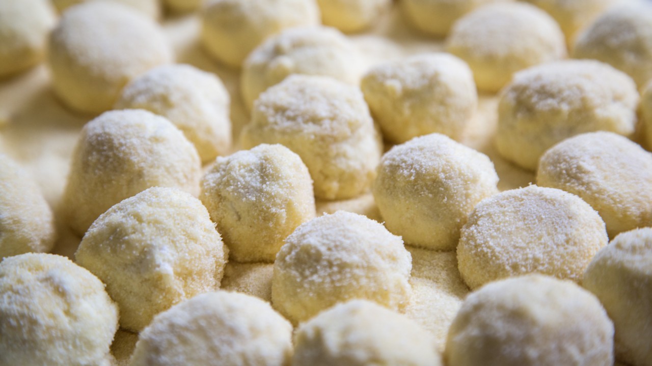 Bestreue ein Tablett großzügig mit Hartweizengrieß. Forme aus der Ricottamischung Kugeln von etwa 3 cm Durchmesser und wende sie im Grieß, bis sie rundum umhüllt sind. Die Gnudi sollten gut mit Grieß bedeckt sein. Lasse sie für 8 Stunden oder am besten über Nacht im Kühlschrank ruhen. Der Grieß entzieht den Gnudi Feuchtigkeit und sorgt so für eine feine, feste Hülle.