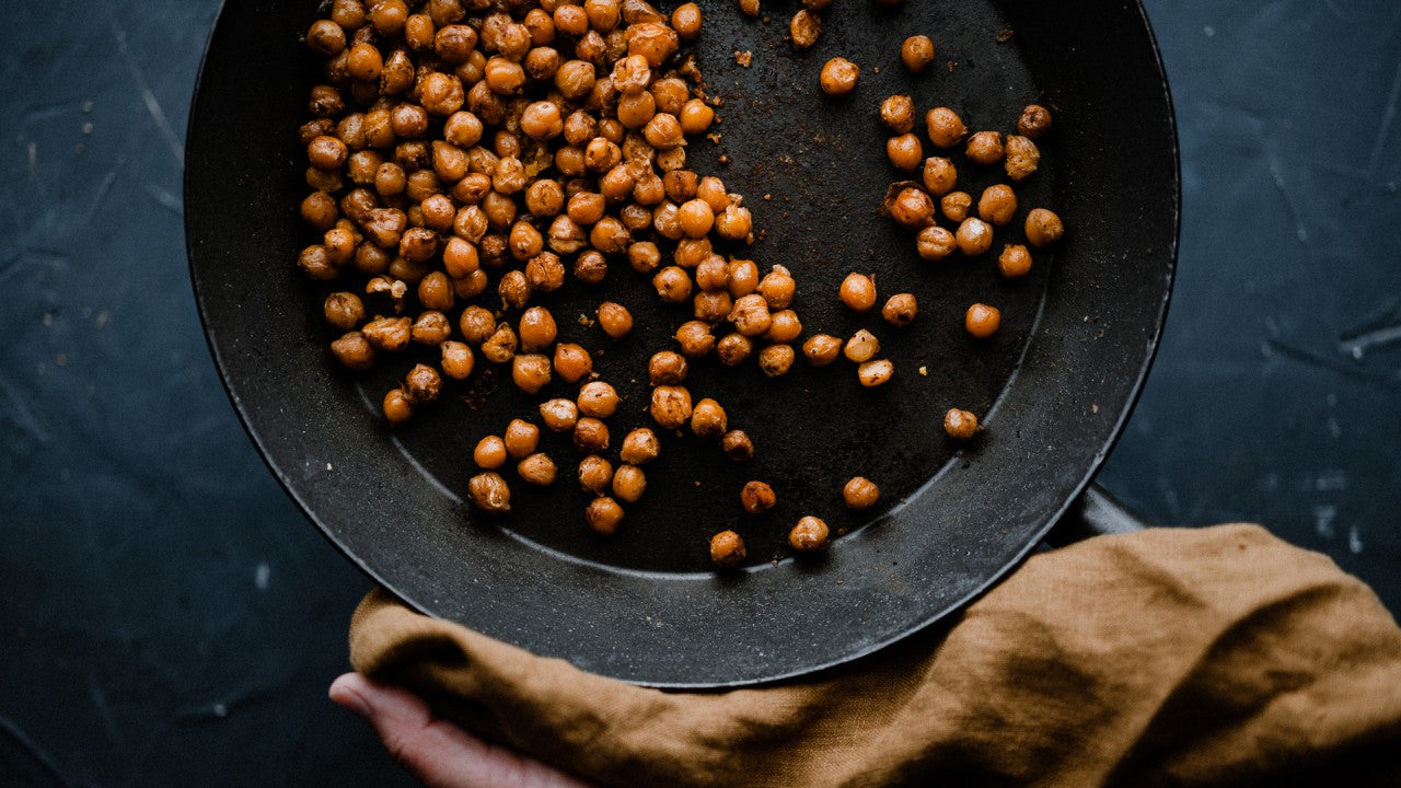 Kichererbsen in einer Pfanne in Kokosöl anrösten.
