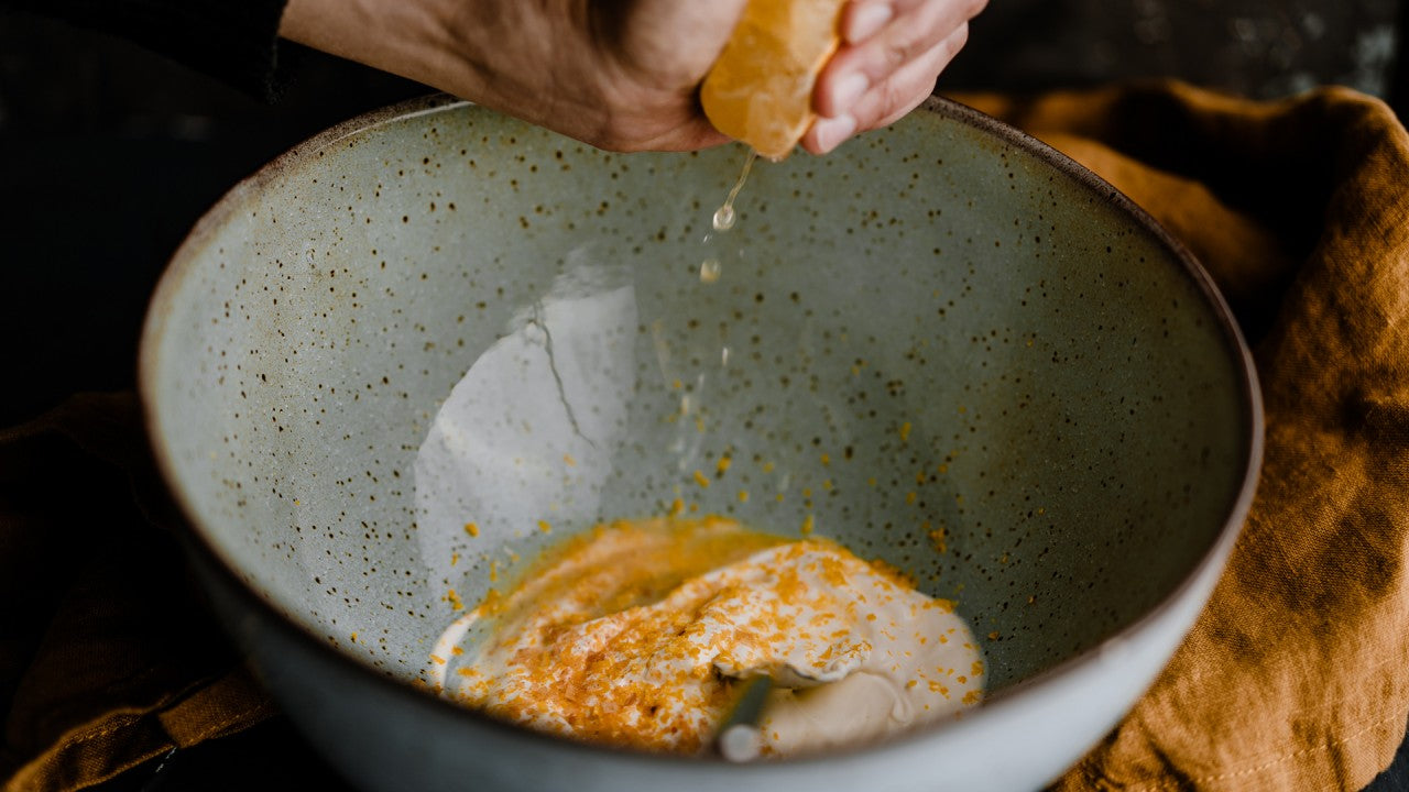 Crème fraîche in einer großen Salatschüssel mit Zitronenschale und -saft, Salatgewürz, Pfeffer und evtl. noch etwas Salz abschmecken.