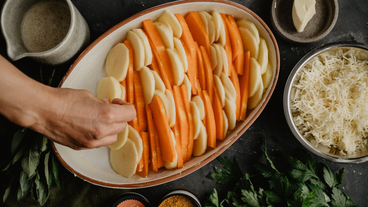 Eine ofenfeste Form mit 1 TL Butter einfetten. Kartoffeln und Kürbis abwechselnd ziegelförmig in die Form schichten. Mit Salz und Pfeffer würzen.