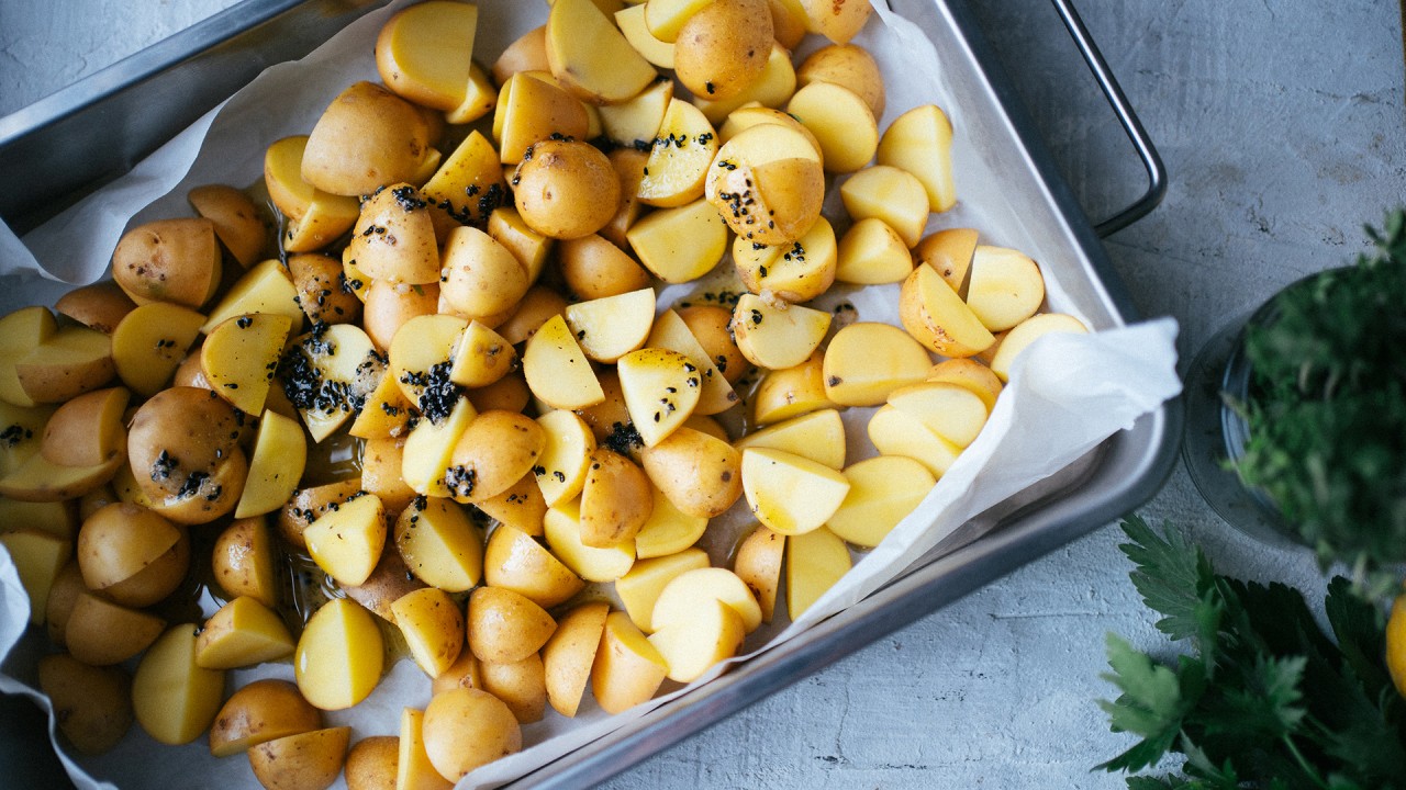 Koriandersamen im Mörser oder in der Gewürzmühle zerkleinern. Kartoffeln mit einer Mischung aus Schwarzkümmel, gemahlenen Koriandersamen, Salz, Pfeffer, Olivenöl und frischem Thymian marinieren. Bei 200 °C Ober-/Unterhitze auf mittlerer Schiene für 30 bis 40 Minuten in den Ofen, bis die Kartoffeln durch sind.