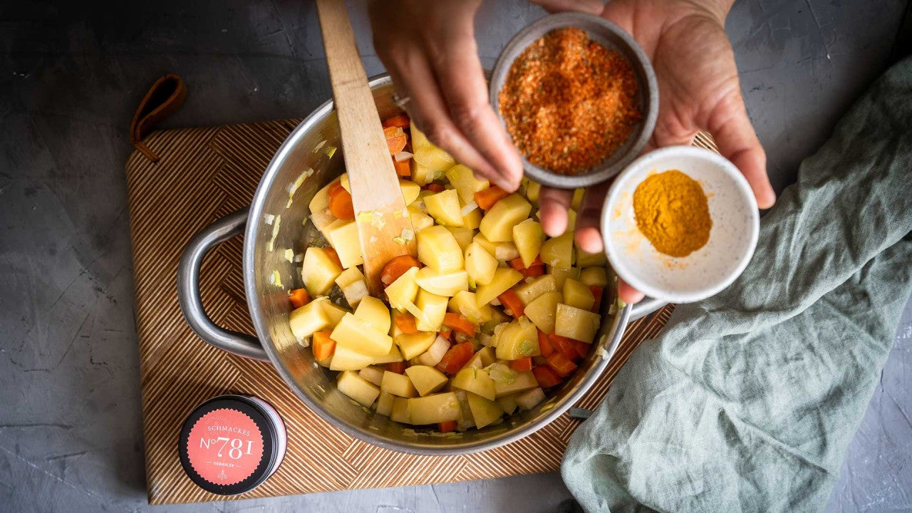 Schmackes und Currypulver unterrühren und die Gemüsebrühe dazu geben. Bei mittlerer Hitze 20 Minuten kochen, bis das Gemüse weich ist. Währenddessen festkochende Kartoffeln schälen und klein würfeln. Restliche Zwiebel fein hacken. Beides im Olivenöl in einer Pfanne weich rösten und würzen. Rohpolnische in Scheiben schneiden.