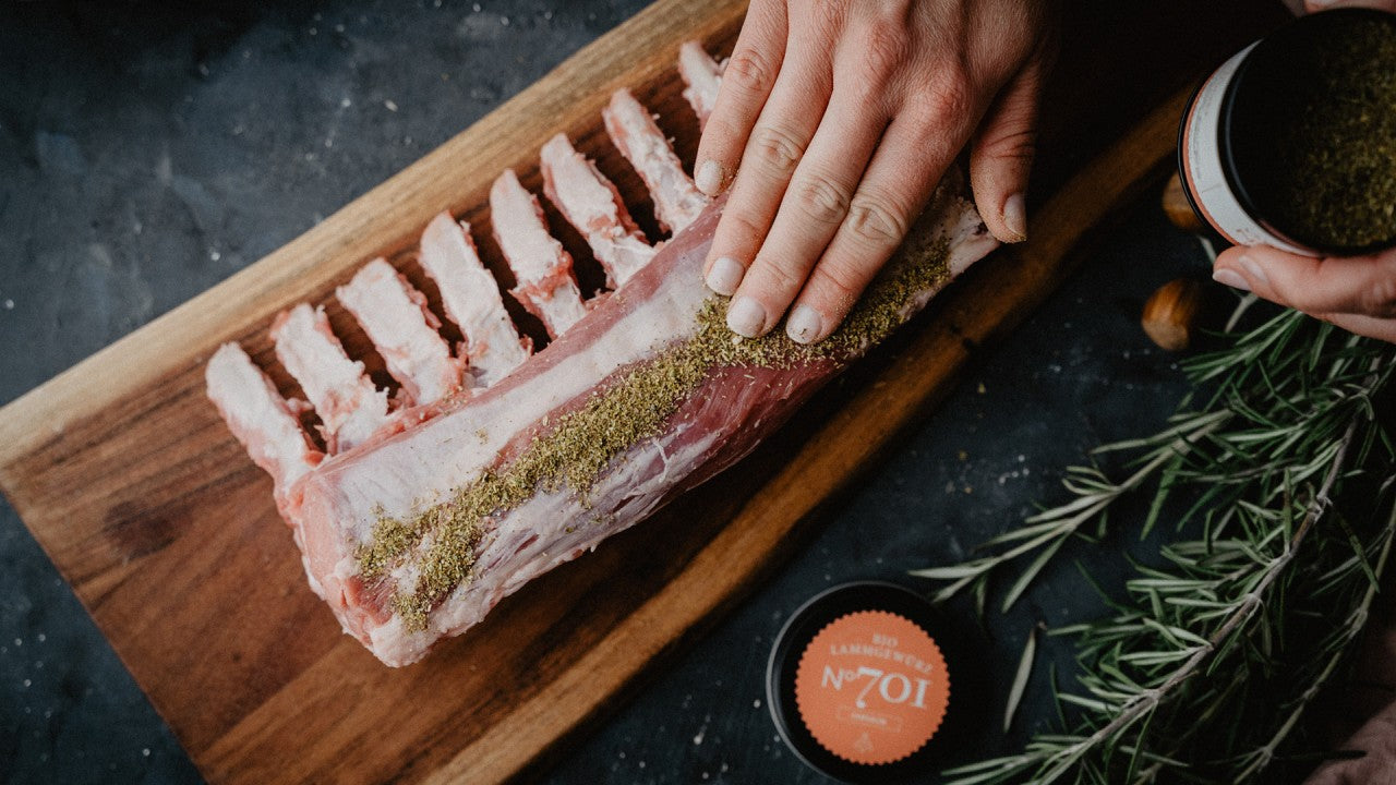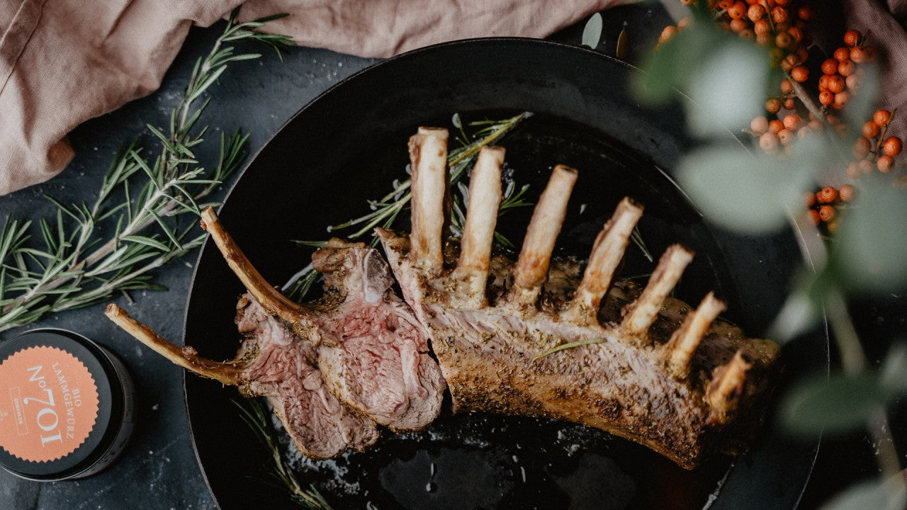 Ofen auf 180 Grad stellen. Karree Knochen säubern und Fleisch mit Lammgewürz einreiben.