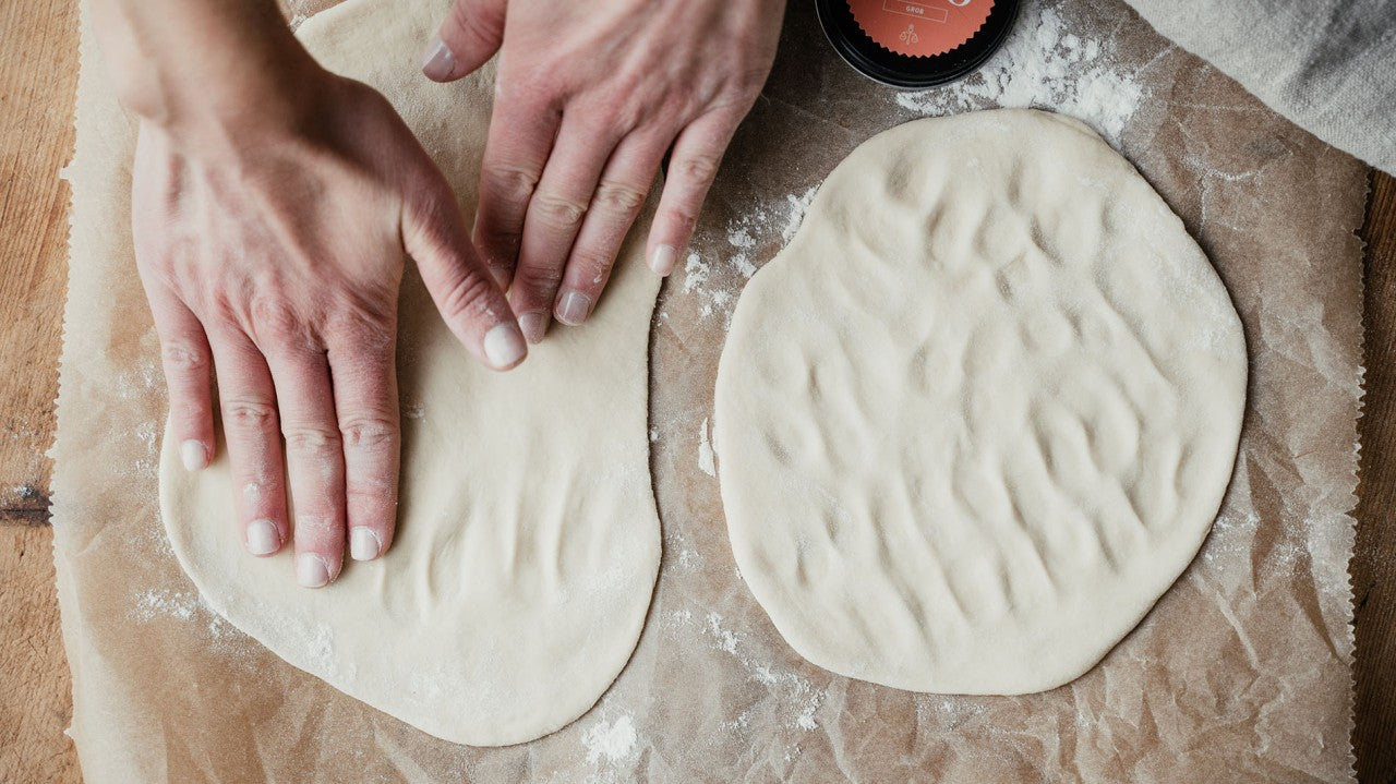 Den Teig in vier gleiche Portionen teilen, länglich ausrollen und gleichmäßige Fladenbrote formen. Überall leichte Kuhlen mit den Fingern eindrücken.