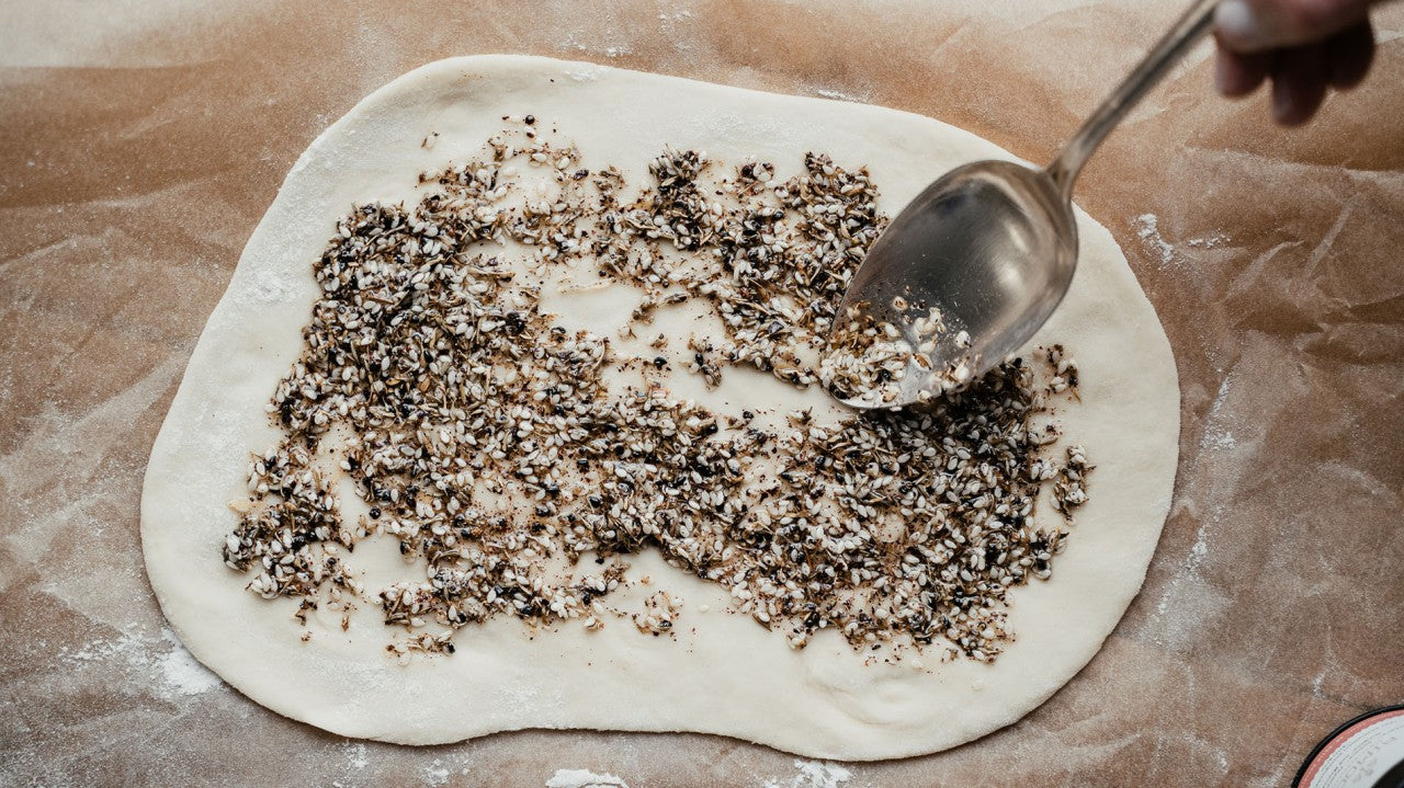 Die Fladen mit der Zatar-Mischung bestreichen und ab in den Ofen für ca. 6–8 Minuten bis sie leicht golden werden.