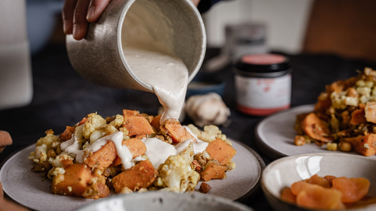 Entdecke jetzt die schnelle und dennoch faszinierende Geschmackswelt des Orients mit unserem verlockenden Rezept. In kürzester Zeit zauberst du geröstetes Gemüse mit süßen Aprikosen und knusprigen Mandeln auf deinen Teller und krönst das Ganze mit einem cremigen Tahini-Dressing. Schnapp dir die Zutaten und los geht's – ein blitzschnelles Abendessen erwartet dich!