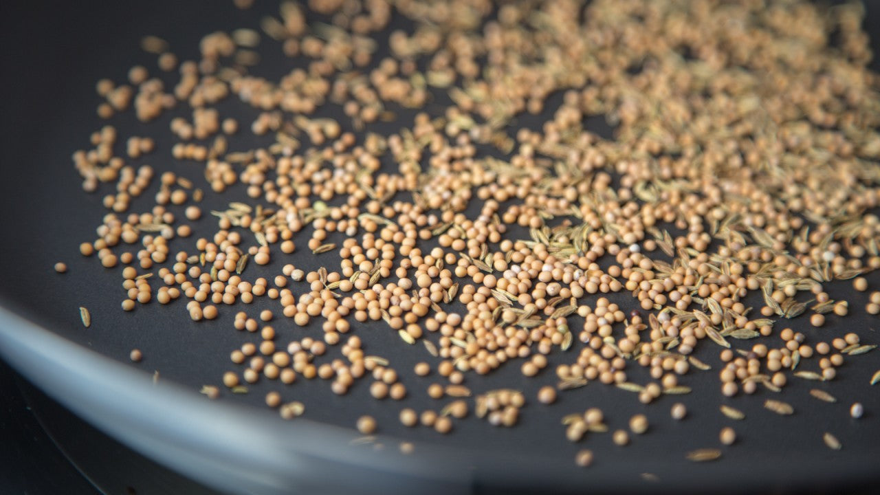 Senfkörner und Kreuzkümmel in einer Pfanne anrösten bis es wunderbar duftet. In einem Mörser fein mahlen.