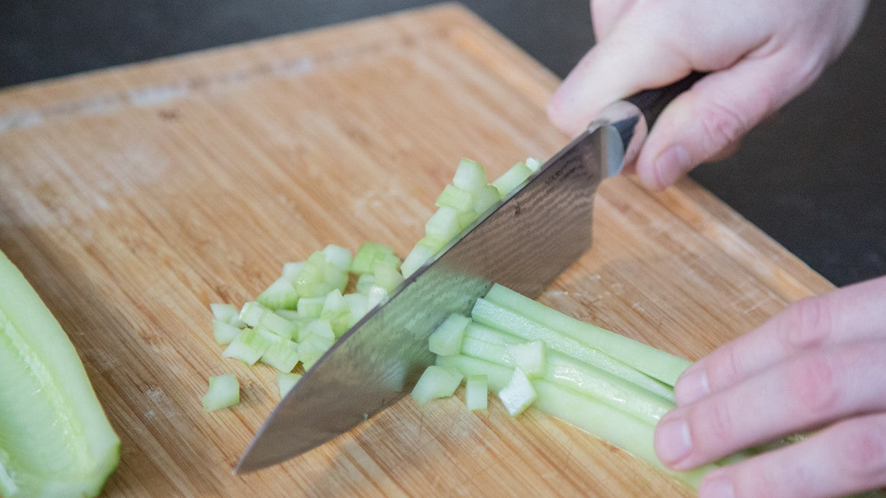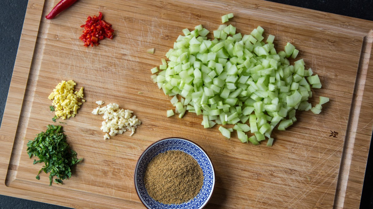 Gurken halbieren und in kleine Würfel schneiden oder raspeln. Du kannst die Gurke auch entkernen, damit dein Raita-Salat nicht zu wässrig wird.