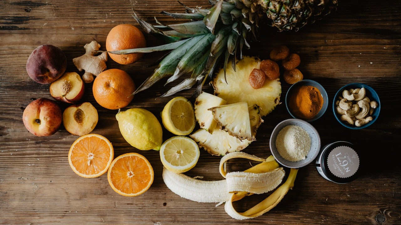 Banane und Orange schälen, Pfirsiche waschen und entkernen.