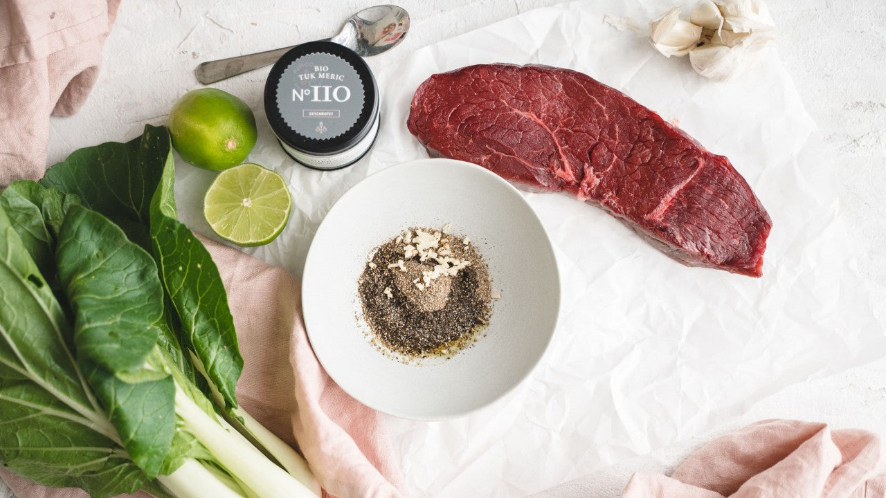 Butter in der Pfanne erhitzen bis sie schäumt. Steaks beidseitig mit etwas Tuk Meric bestreuen und nochmals 1 Min. pro Seite anbraten. Der Kokosblütenzucker in unserem Tuk Meric Pfeffer karamellisiert beim Anbraten und sorgt so dafür, dass sich eine schöne Kruste bildet.