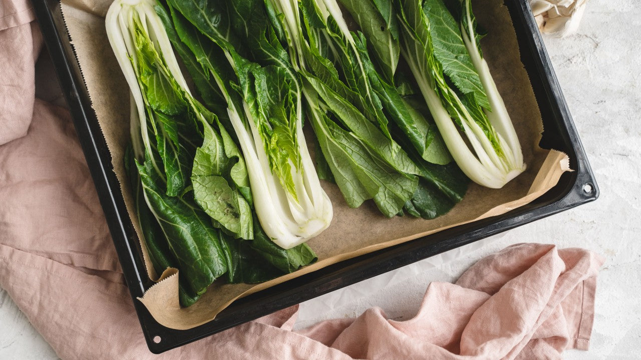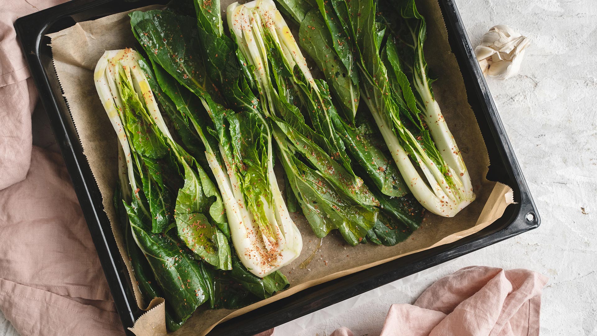 Ofen auf 180 Grad vorheizen. Die äußeren Blätter vom Pak Choi entfernen und den untersten Teil des Strunks wegschneiden. Pak Choi längs halbieren und auf ein mit Backpapier belegtes Backblech nebeneinander legen. Mit Olivenöl beträufeln und mit Chiliflocken und Meersalz betreuen.