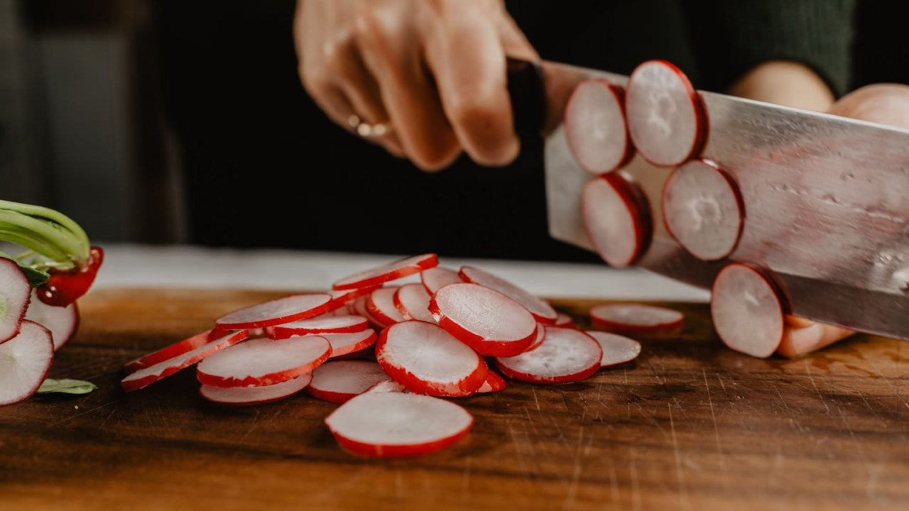 Radieschen in feine Scheiben und Frühlingszwiebeln in Ringe schneiden.