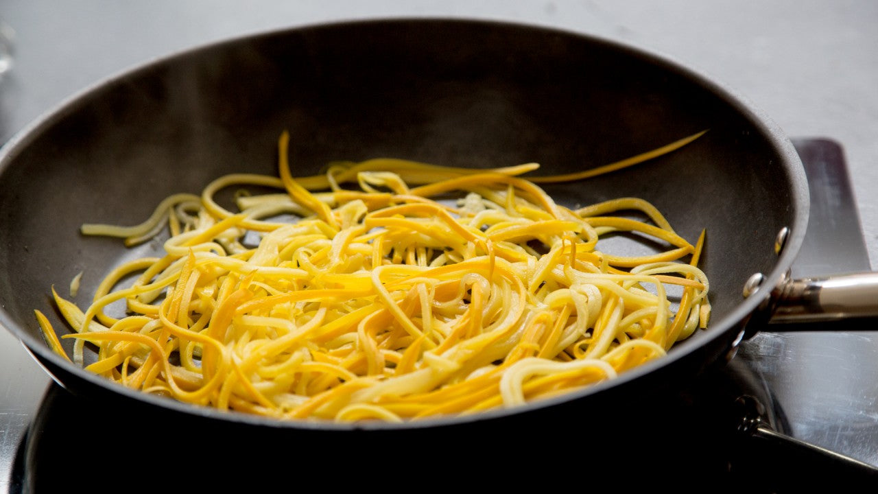 Mit einem Gemüse-Schäler oder Spiraldreher dünne Streifen (Julienne) aus den Zucchini schneiden.