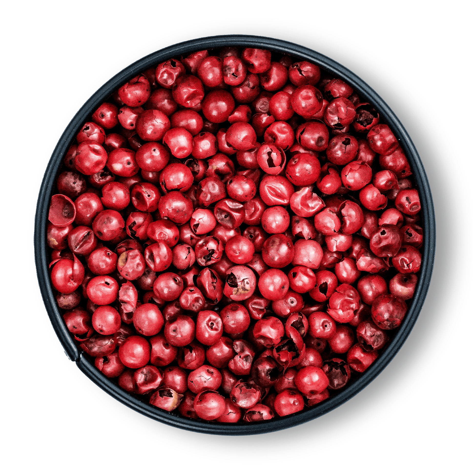 Diese herrlichen Rosa Beeren sind sowohl optisch als auch geschmacklich ein Knaller! Tatsächlich werden die Zweige des opulent blühenden brasilianischen Pfefferbaumes auch hierzulande gerne von Floristen in sommerlichen Blumenbouquets verwendet. Doch die wunderschöne Beere kann noch viel mehr, wenn sie erstmal auf deinen Teller darf. Aufgrund der äußeren Ähnlichkeit spricht man im Allgemeinen von Rosa Pfeffer, obwohl die Beere des Schinusbaumes botanisch gesehen gar kein Pfeffer ist. Das merkst du spätestens, wenn du eine getrocknete Beere probierst, denn sie schmeckt zwar pikant, aber süßlich mit einem Hauch von Zitrusfrucht, ohne die dem Pfeffer eigene Schärfe.