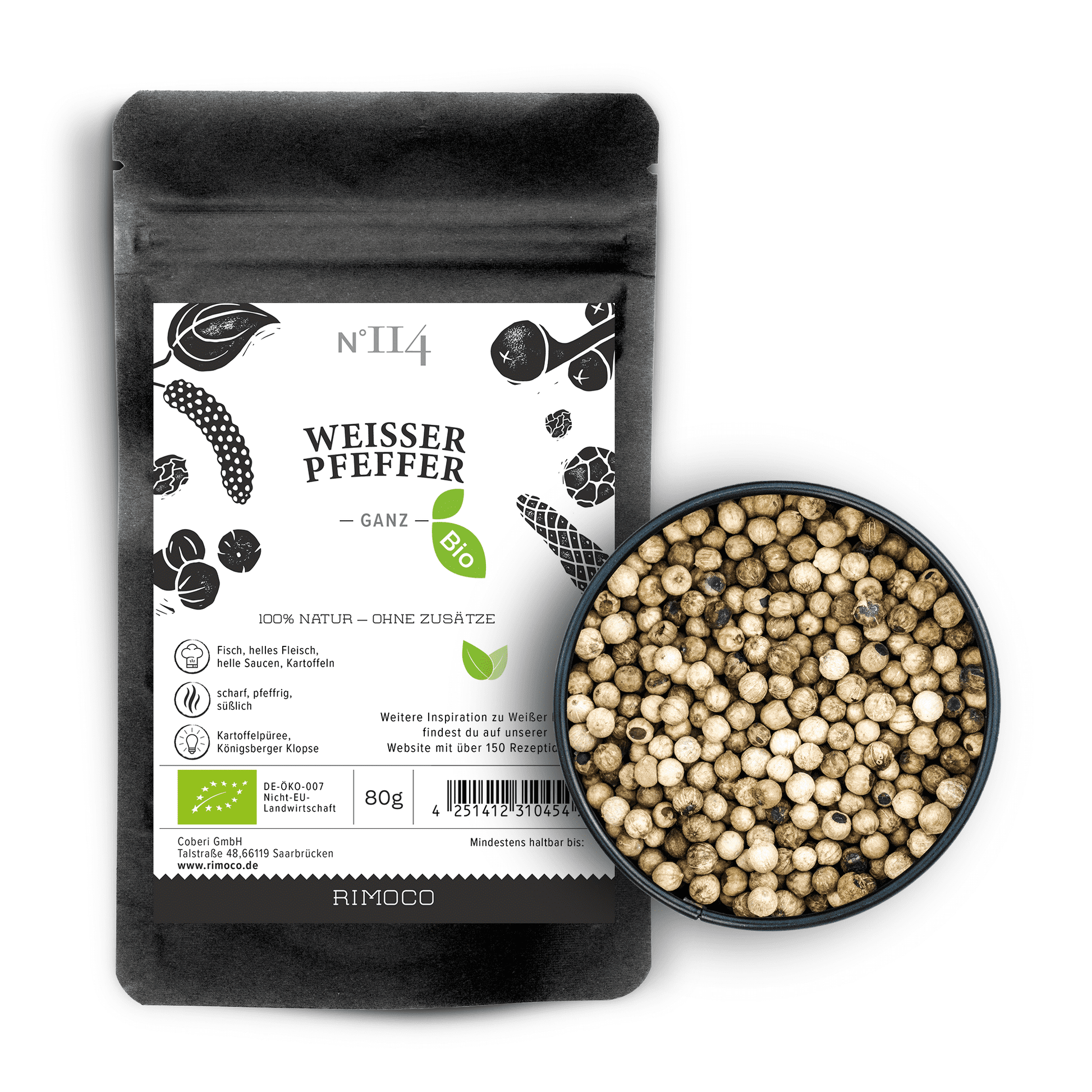 Wenn du die Informationen zu unseren Gewürzen sorgfältig gelesen hast, ist dir das sicher schon bekannt: Schwarzer, weißer, grüner und roter Pfeffer sind die Beeren von ein und derselben Pflanze. Die unterschiedlichen Farben und Aromen entstehen durch die verschiedenen Ernte- und Weiterverarbeitungsprozesse. Während schwarzer Pfeffer unreif geerntet und anschließend fermentiert wird, bleiben die Beeren für die Gewinnung von unserem Bio Weißem Pfeffer fast bis zum Erreichen des vollen Reifegrades am Strauch. Die Schale der Beeren ist dann bereits rötlich. Nur der rote Pfeffer wird vollreif geerntet. Unter dieser Schale verbirgt sich der edle, helle Pfefferkern, den wir für unseren weißen Pfeffer benötigen. Durch seine schonende Verarbeitung und die lange Reifung erhält der weiße Pfeffer seine milde und gleichzeitig vollmundige Schärfe.