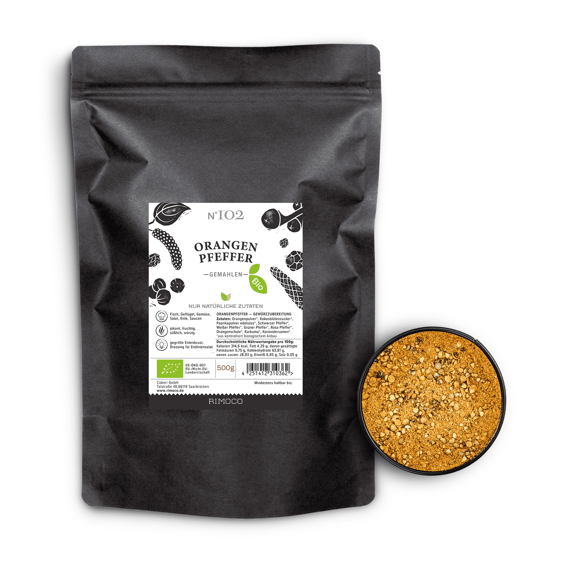 Hierzu haben wir buntem, geschrotetem Pfeffer reichlich Orangenfruchtpulver und gemahlene Orangenschale beigefügt. Kurkuma verleiht unserem Orangenpfeffer seine erdig-leuchtende Farbe. Doch daher rührt auch die sehr feine Ingwernote, die dem geübten Gaumen nicht entgehen wird. Jaggery (Vollrohrzucker), Paprika und Koriandersamen machen das Ensemble perfekt.