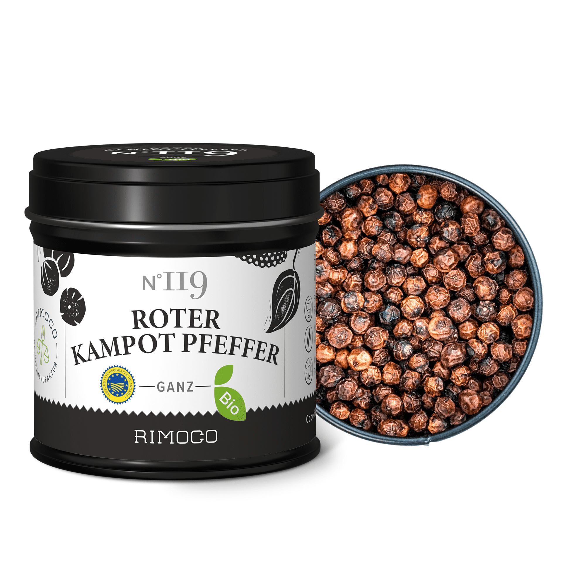 Seine vielschichtigen Aromen entwickeln sich nur hier aufgrund der optimalen klimatischen Bedingungen, nährstoffreichen Böden und dem bergigen Hinterland, vor dem sich die salzige Seeluft staut. Grüner, schwarzer, weißer und roter Pfeffer stammen dabei von der gleichen Pflanze und entsprechen unterschiedlichen Reifegraden. Roter Pfeffer wird aus der voll ausgereiften Pfefferbeere gewonnen und entwickelt durch den erhöhten Zuckergehalt im Fruchtfleisch ein besonders fruchtiges Aroma. Nur etwa 20 Prozent der Pfefferfrüchte bleiben bis zur Vollreife am Strauch. Geerntet wird der rote Kampot Pfeffer dann als hellrote Beere. Erst beim Trocknen in der Sonne entwickelt er seine charakteristische dunkelrote Farbe. Durch all diese Besonderheiten gelangen pro Jahr nur etwa 200 kg des Premiumpfeffers auf den Markt. Roter Kampot Pfeffer ist damit eine wahre Rarität und besonders kostbar!