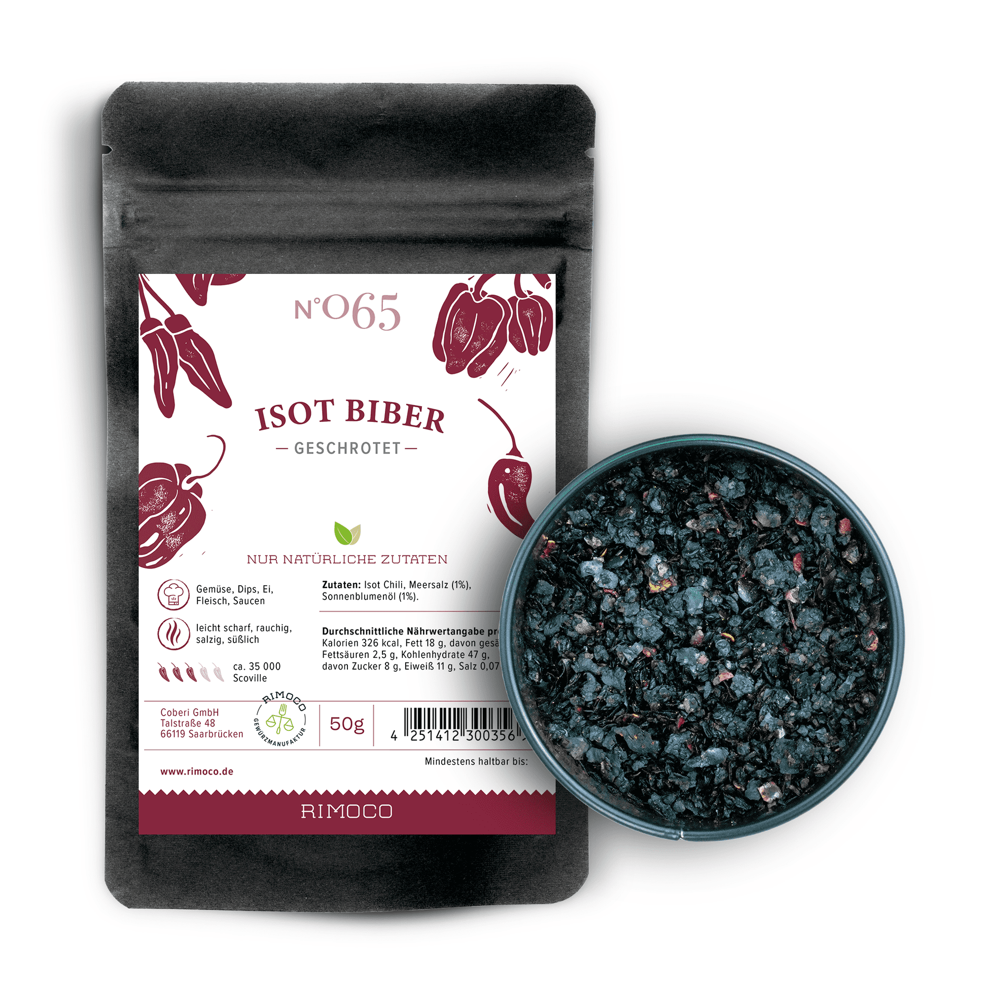 Auffallend an Isot Biber ist sofort die besondere Färbung: Öffnest du die Aromadose, begrüßt dich ein tiefes Rot, das fast schon als schwarz durchgeht. Wer hier aber einen klassischen Fall von viel Tam-Tam und nichts dahinter erahnt, irrt sich gewaltig! Isot Biber überzeugt durch ein tiefes, vielschichtiges Aroma, das süß und salzig in sich vereint und mit einer angenehmen, mittleren Schärfe kombiniert, die etwas zeitversetzt eintritt. Dazu gesellt sich ein Rauch-Aroma (und dass, obwohl die Chili nicht geräuchert wird), welches das Geschmackserlebnis abrundet und für eine willkommene Überraschung sorgt. Wer es noch genauer wissen will, schmeckt Noten von Tanninen, die an Wein oder dunkle Schokolade erinnern, oder sogar rosinenartige Aromen (vergleichbar mit Ancho und Pasilla Chilis). Passend dazu riecht Isot Biber fast schon ein bisschen nach dunklem Karamell und eher weniger nach scharfer Chili. Es ist also ein wenig Vorsicht geboten, nicht dass du es versehentlich unter dein Lieblings-Cookies-Rezept mischst. Denn auch von der Textur her ist die Chili-Spezialität besonders. Anstelle des üblichen knalligen Pulvers erwartet dich eine grobkörnige, fast schon ölige oder feuchte Konsistenz, für die unterschiedlich große Flocken charakteristisch sind. Das macht das Ganze nicht nur im Mund sehr angenehm, sondern eignet sich auch hervorragend zum Garnieren und Dekorieren. Ein ideales Rezept um sich mit Isot Biber an die orientalische Küche heranzutasten ist unsere pikante Aubergine mit Tahini-Joghurt und Granatapfelkernen, bei dem du die Chili sowohl in der Marinade als auch zum dekorieren wunderbar nutzen kannst.