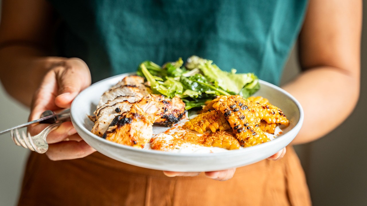 - Den Mais auf den Grill legen und von beiden Seiten goldbraun rösten. Zum Servieren die Hähnchenbrust in Scheiben schneiden und zusammen mit dem Zitronenjoghurt, gegrillten Mais und einem grünen Blattsalat auf Tellern anrichten.