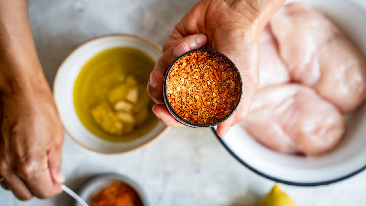 - In einer flachen Schüssel Olivenöl, Zitronensaft, fein gehackten Knoblauch, Schmackes Gewürz, Honig und Senf verrühren. Hähnchenbrust dazugeben und gleichmäßig mit der Marinade bedecken. Die Schüssel abdecken und das Fleisch 1 Stunde im Kühlschrank marinieren lassen.