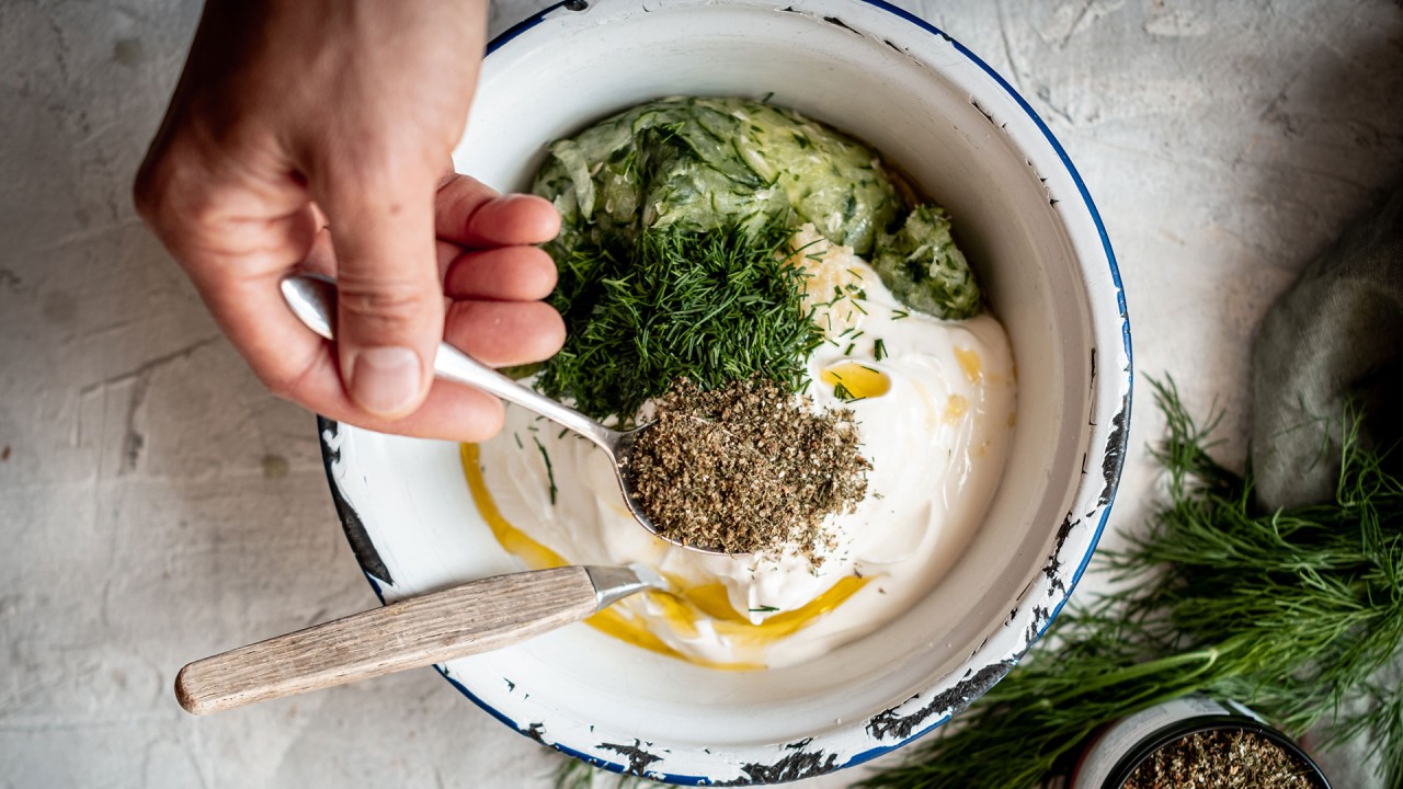 - Währenddessen für das Tzatziki Gurke grob raspeln, in ein sauberes Küchentuch geben und gut ausdrücken. Mit Joghurt, Knoblauch, Gurkensalatgewürz, Öl, Zitronensaft und gehacktem Dill verrühren. Mit Salz und Pfeffer abschmecken. Mindestens 15 Min. durchziehen lassen.