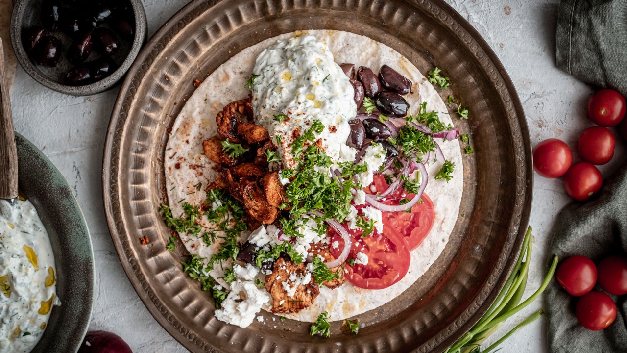 - Gyros mit Tzatziki, Pitabrot oder Fladenbrot, Zwiebelringen, Tomatenscheiben, Oliven, zerkrümeltem Feta und frischen Kräutern servieren.