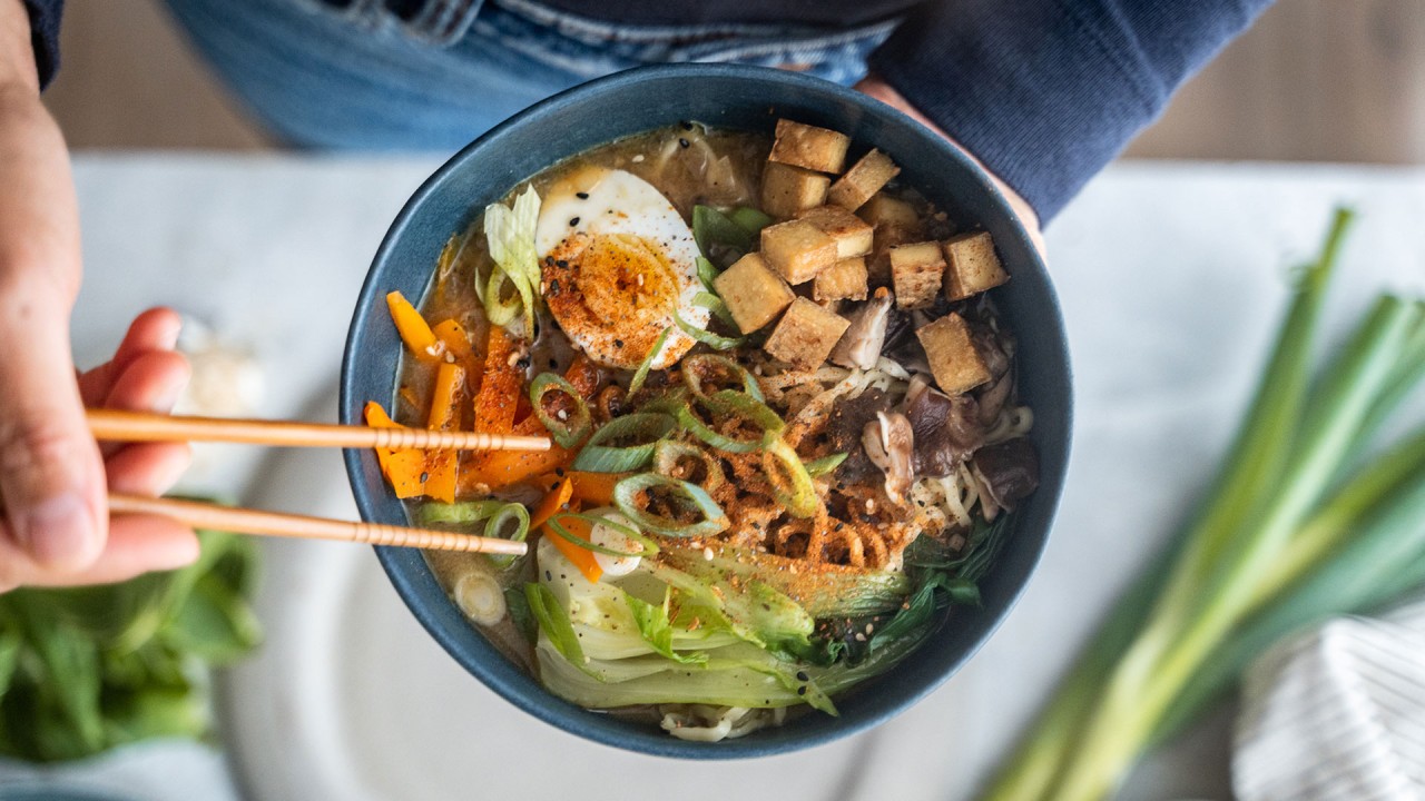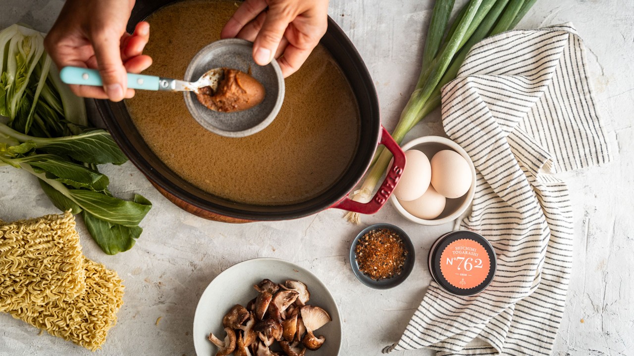 Du wolltest dich schon immer mal an selbstgemachter Ramen-Suppe versuchen? Dieses Rezept zeigt dir, wie einfach es geht – mit wenigen Handgriffen zauberst du eine japanisch inspirierte Nudelsuppe voller Aromen, die Körper und Seele wärmt. Die cremige Brühe mit Gemüse würzen wir mit Shichimi Togarashi.
