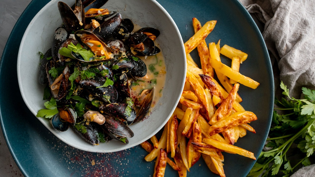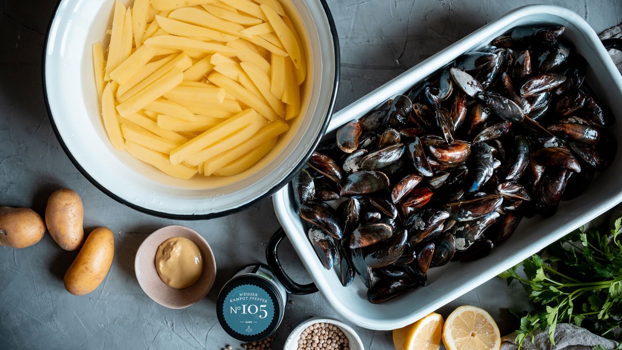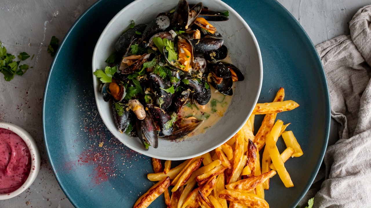 - Muscheln in tiefen Schalen mit etwas Sud anrichten. Frites separat servieren, damit sie knusprig bleiben. Purple Curry Mayo in einem kleinen Schälchen dazu reichen. Optional etwas frischen weißen Kampot Pfeffer über die Muscheln mahlen und mit Zitronenzeste garnieren.