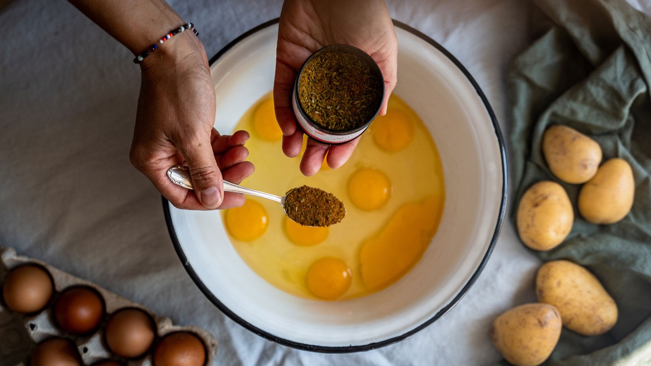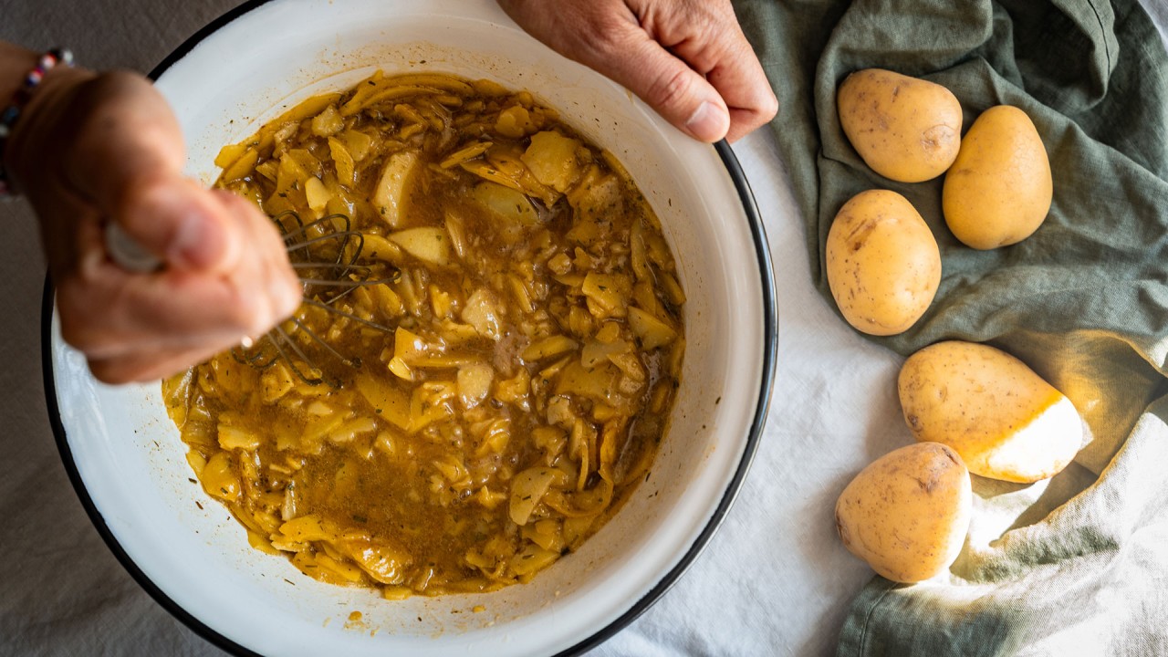 - Eier in eine große Schüssel aufschlagen und mit dem Rührei Gewürz und Salz verquirlen. Die abgetropften Kartoffeln mit einer Schaumkelle dazugeben und grob mit einem Schneebesen zerdrücken. Die Mischung 15 Minuten ruhen lassen und zwischendurch immer wieder umrühren.